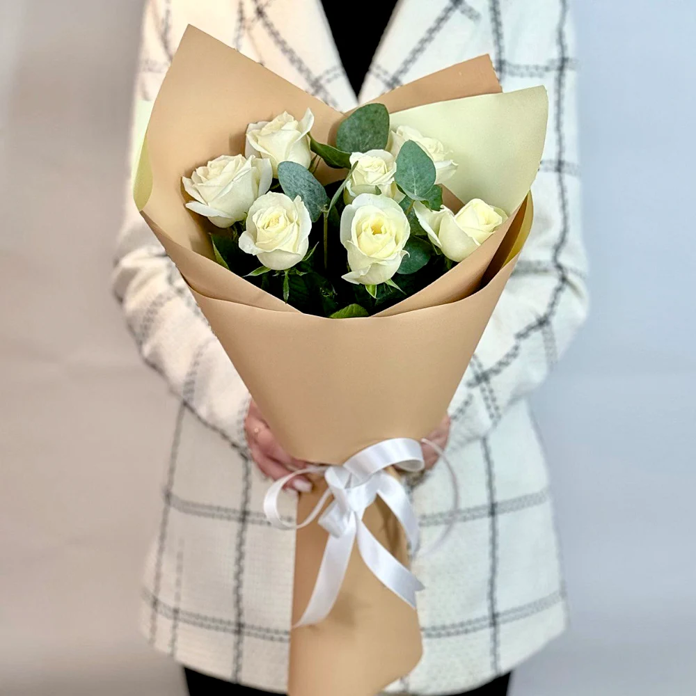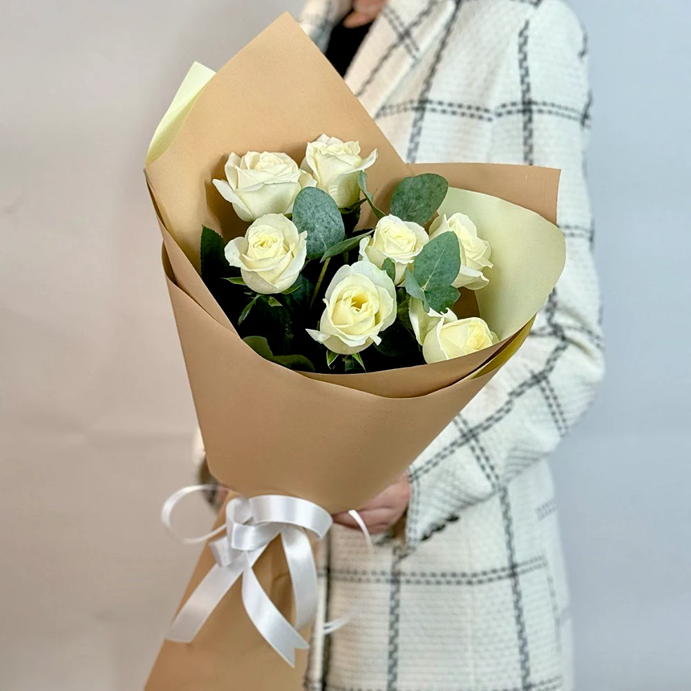 Белая роза, эвкалипт, дизайнерская упаковка.
