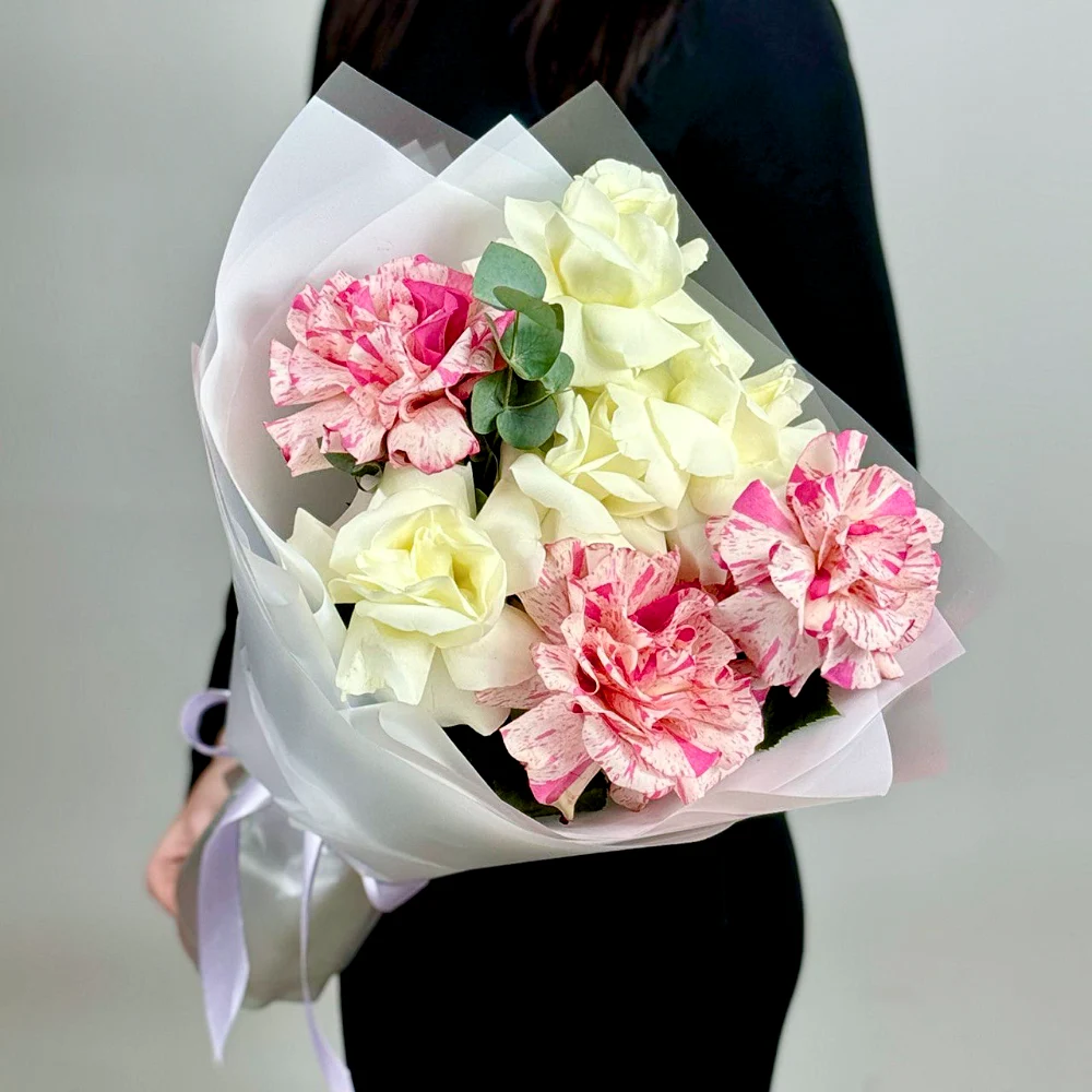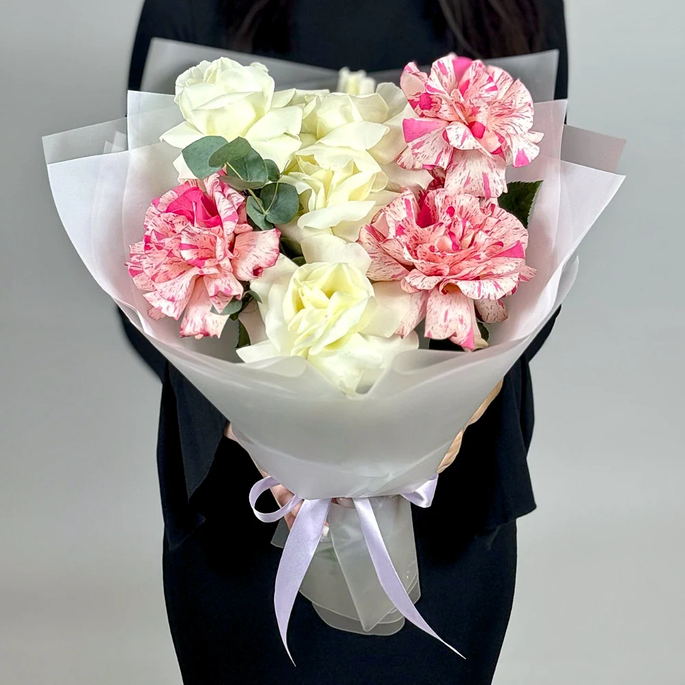 Французская роза белая, нежно-розовая роза, эвкалипт, дизайнерская упаковка.