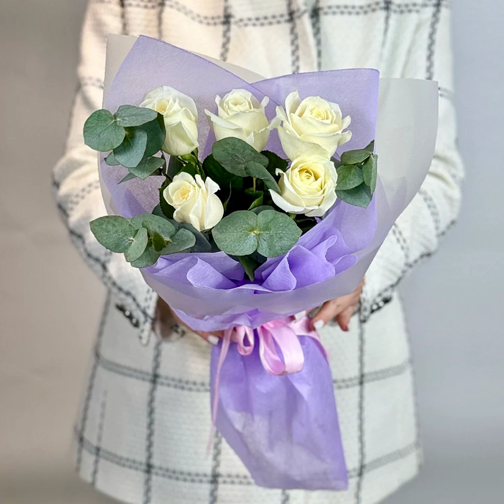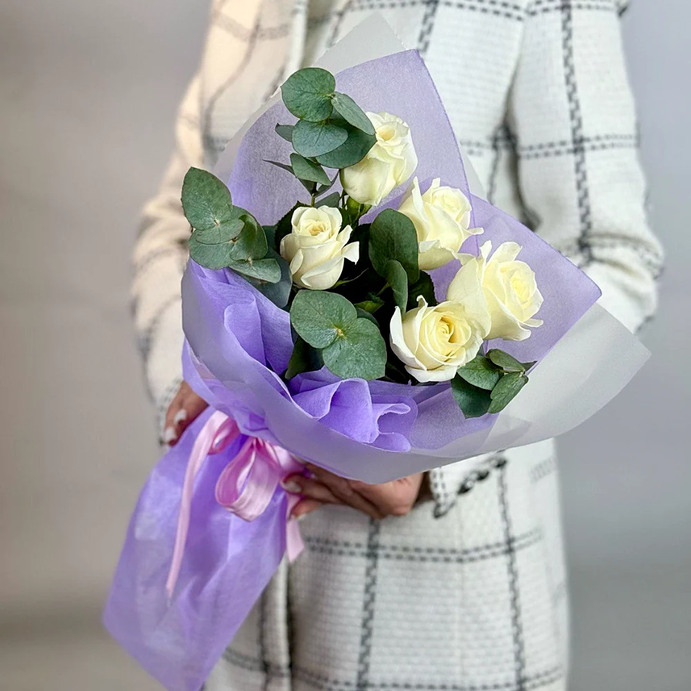 Белая роза, эвкалипт, дизайнерская упаковка.