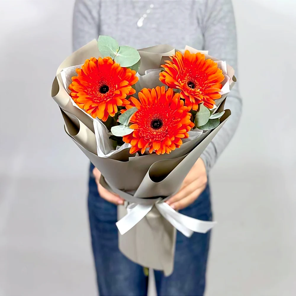 Оранжевая гербера 3 шт. эвкалипт, дизайнерская упаковка.