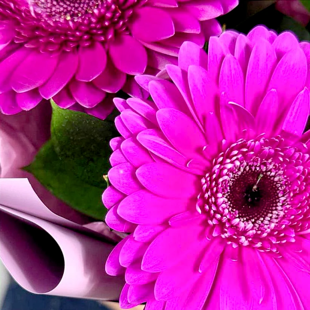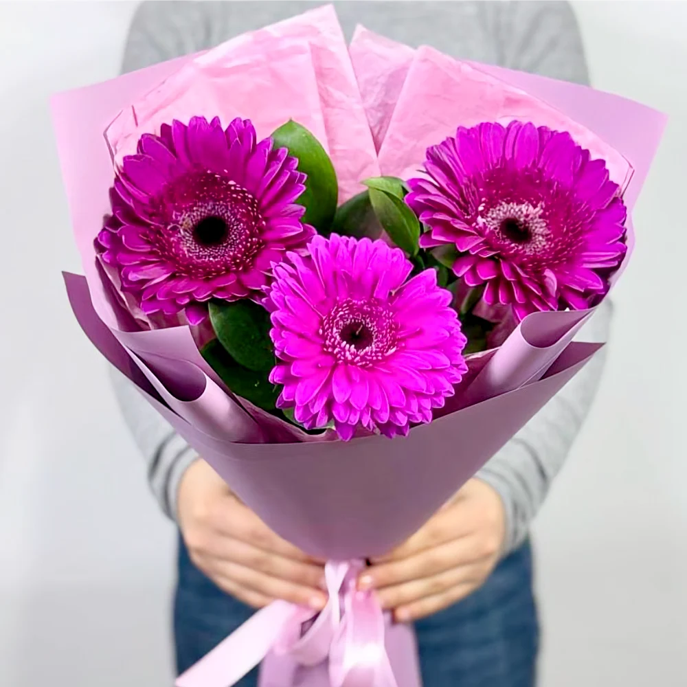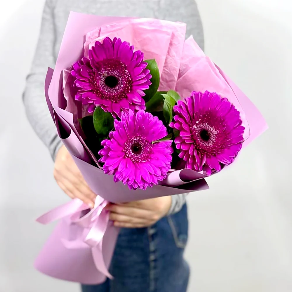 Фиолетовая гербера 3 шт. рускус, дизайнерская упаковка.